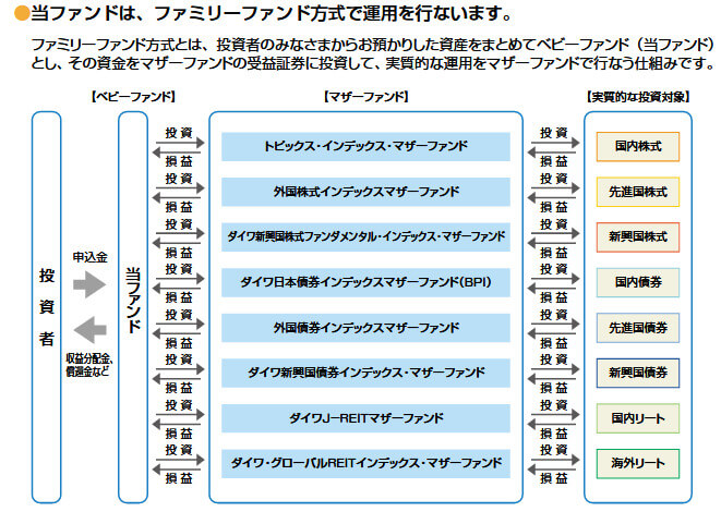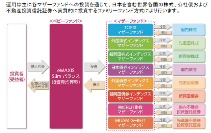 eMAXIS Slimバランス(8資産均等型)はファミリーファンド方式での運用になります。
