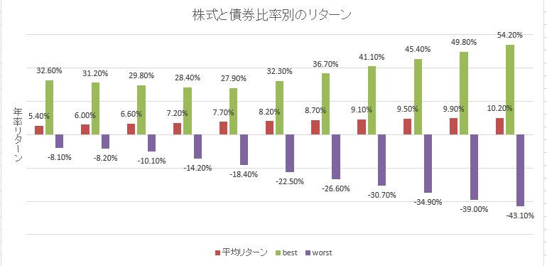 では、株式と債券の比率を変えることによって、どのくらいリターンが違ってくるのかをみてみましょう。