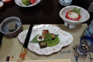 中央に前菜、右上に替わり鉢のスモークサーモンとトマトのサラダ、先付けは茄子の利休寄せです。