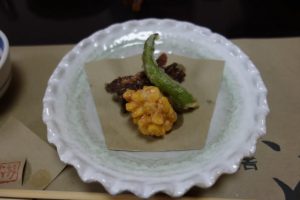 とうもろこしや甘長ピーマンの天ぷら、岩魚の骨せんべいでした。